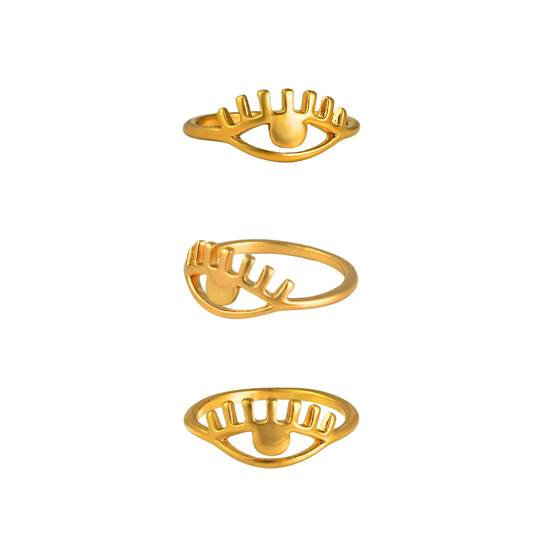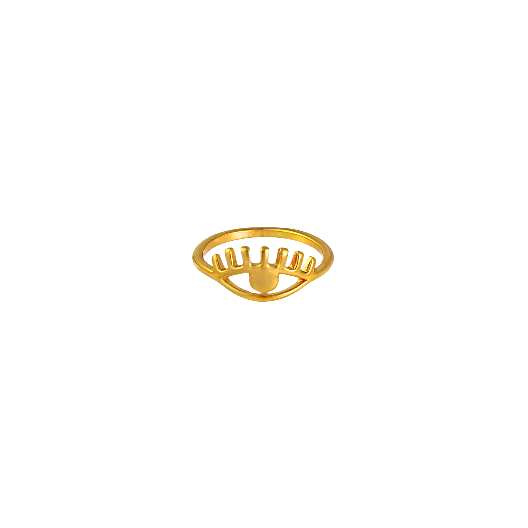 This golden minimalist eye-shaped ring features sleek, clean lines that create a simple yet striking design. The eye symbolizes intuition, perception, and protection, while the delicate gold lines add an element of elegance and mystery, making it a sophisticated statement piece.