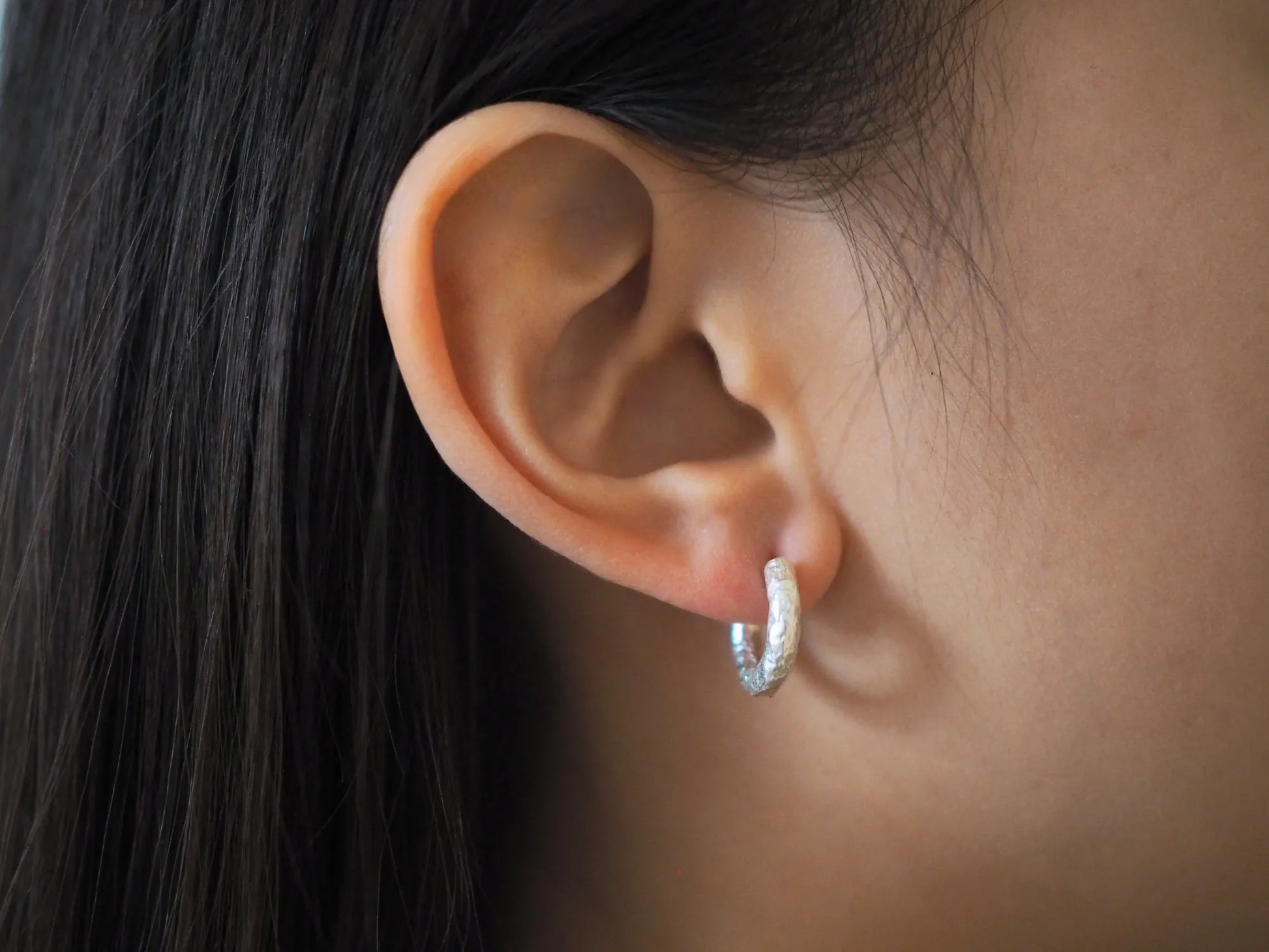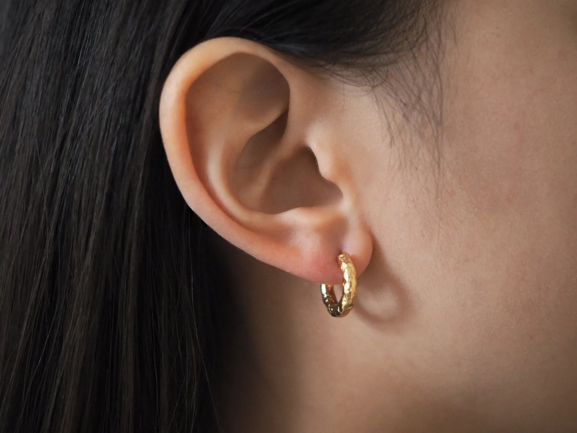 A minimalist hoop, softly etched with subtle textures, evoking organic forms and gentle imperfections. Simple yet expressive, it adds quiet depth and understated elegance to your everyday style.